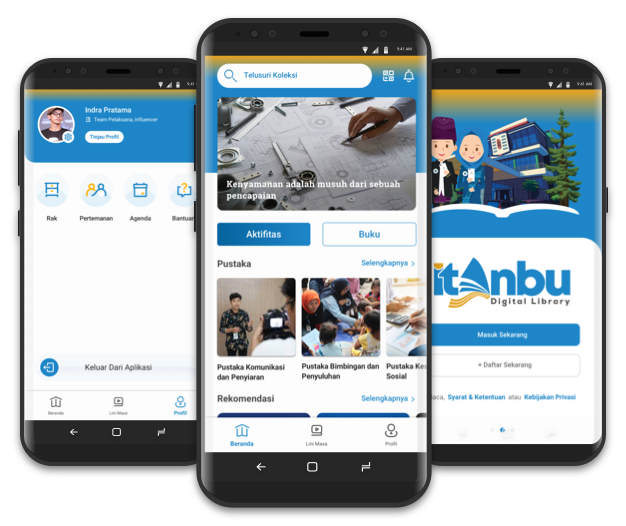 Laman utama aplikasi iTanbu, Laman utama terdiri dari banner berisikan visual post atau iklan, jenis koleksi kumpulan buku bacaan selanjutnya dibawah adalah card koleksi berdasarkan kategori dan dibagian paling bawah adalah menu utama. Menu utama dapat digunakan pengguna untuk melihat aktivitas, layanan Layanan Perpustakaan Digital, layanan iTanbu, koleksi buku, detail buku, peminjaman buku, list epustaka, melihat banner, pencarian, melihat notifikasi, mengakses halaman lainnya, seperti lini masa dan profil pengguna.